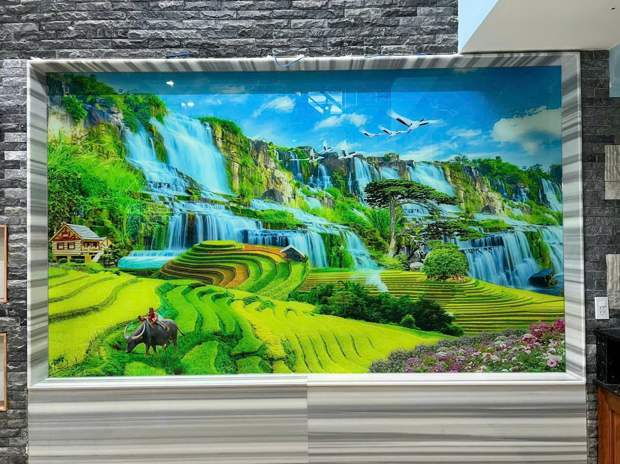 Kính in 3D thường được dùng để tạo điểm nhấn vì vừa có độ bóng của kính, vừa có hình in trang trí nổi bật, giúp không gian nhìn hiện đại và sang hơn.
